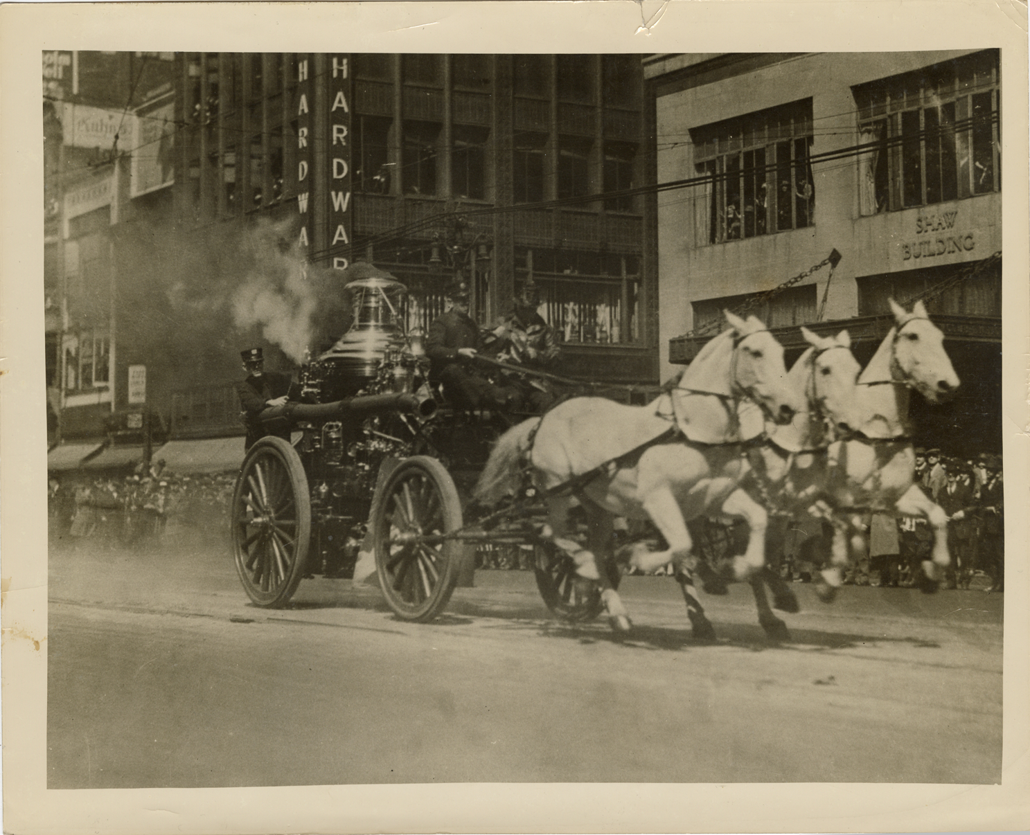 View of firefighters driving horse-drawn fire engine down the Woodward Avenue, in recognition of the retirement of Detroit Fire Department horses from service. Spectators stand on sidewalks; commercial buildings in background. Label on back: "Engine #2 horses, 1) Jenny, 2) Tom, Belle Isle, 3) Dick. Driver Ed. McClellan, Capt. Simon Hughes, engineer George Moore. Eng. 38 apparatus. Horses were at Eng. 38 where the horses were at, at the time. McClellan was their regular driver at Eng. 2." Handwritten on back: "Their last run, April 10, 1922. [undecipherable] C.O. operator."