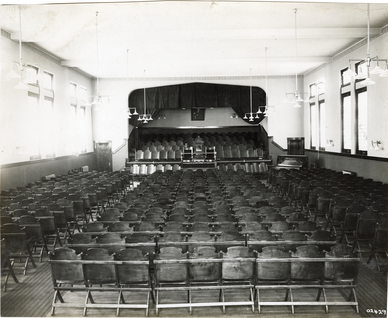 View of auditorium in Salvation Army building located at Flint, Michigan. Rows of seats in foreground; stage and podium in background. Piano on right. Handwritten on back: "Salvation Army, Flint, MI."