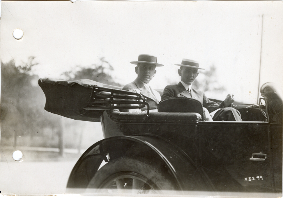 View of two salesmen posing in car during the sales convention at the Burroughs Adding Machine Company. Handwritten on back: "Convention at Burroughs Adding Machine Co., 1912."