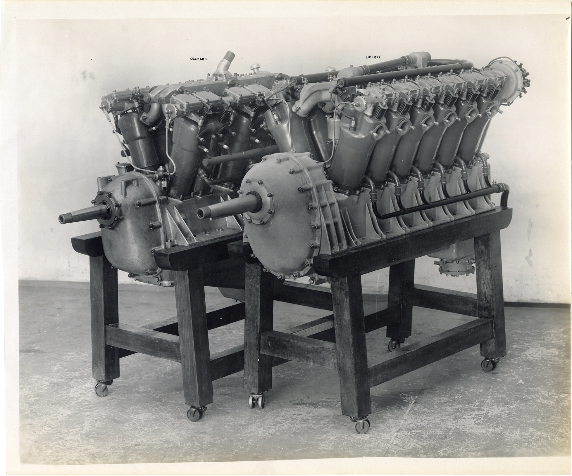 View of a Packard airplane engine and a Liberty airplane engine, displayed on stands. Printed on front: "Packard, Liberty."