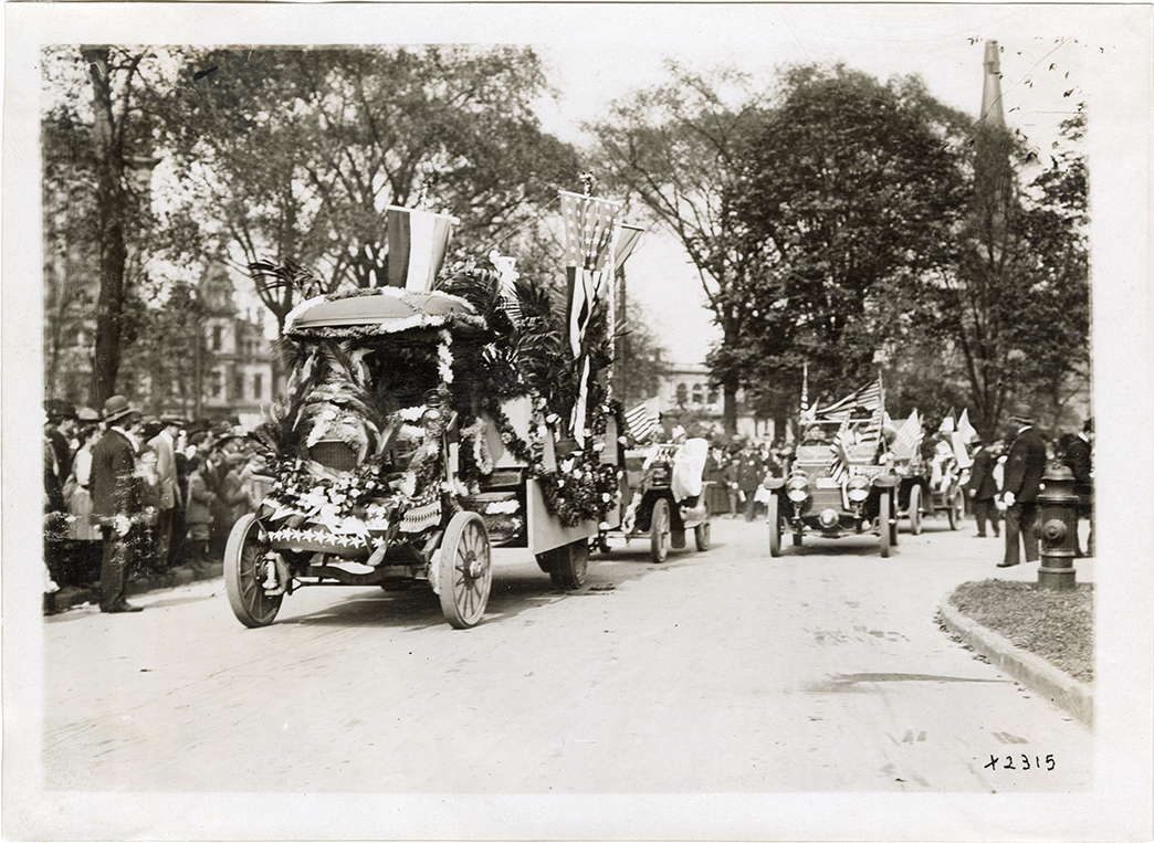 View of decorated cars in a parade for the dedication of the Christopher Columbus portrait bust at the north end of Grand Circus Park. Sculpture was designed by Augusto Rivalta.