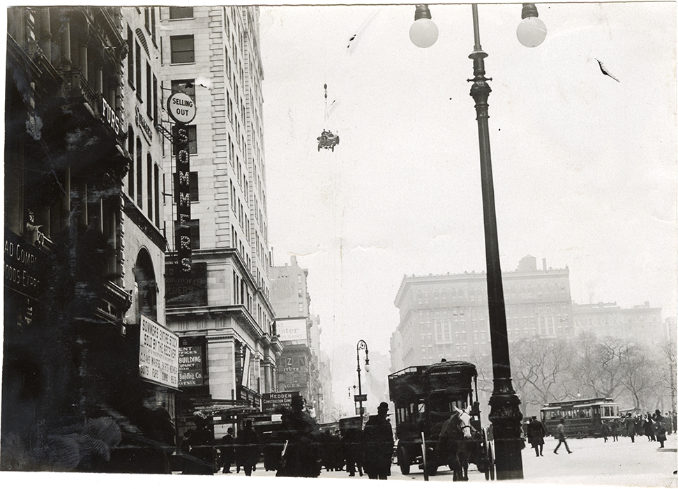 View of a 30 horsepower Kissel Kar runabout being hoisted to the upper levels of the new Fifth Avenue Building in New York, as part of a publicity stunt. Commercial buildings, pedestrians, double-decker bus, lamppost and streetcar in foreground. Stamped on back: "Spooner & Wells, Inc., photographers, telephones 3472-3473 Columbus, 1931 Broadway, New York."