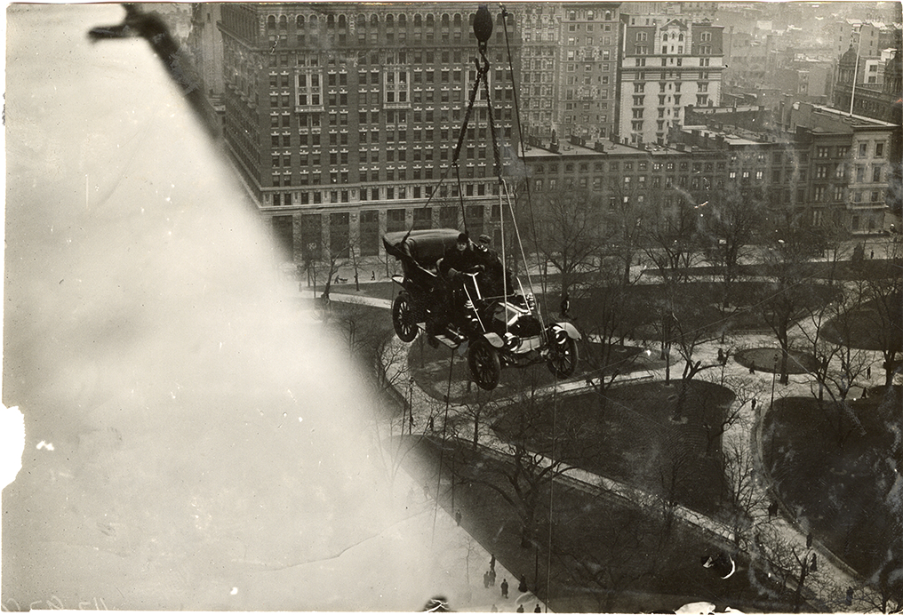 Bird's-eye view of two men in a 30 horsepower Kissel Kar runabout being hoisted to the upper levels of the new Fifth Avenue Building in New York, as part of a publicity stunt. Park in background. Stamped on back: "Spooner & Wells, Inc., photographers, telephones 3472-3473 Columbus, 1931 Broadway, New York."