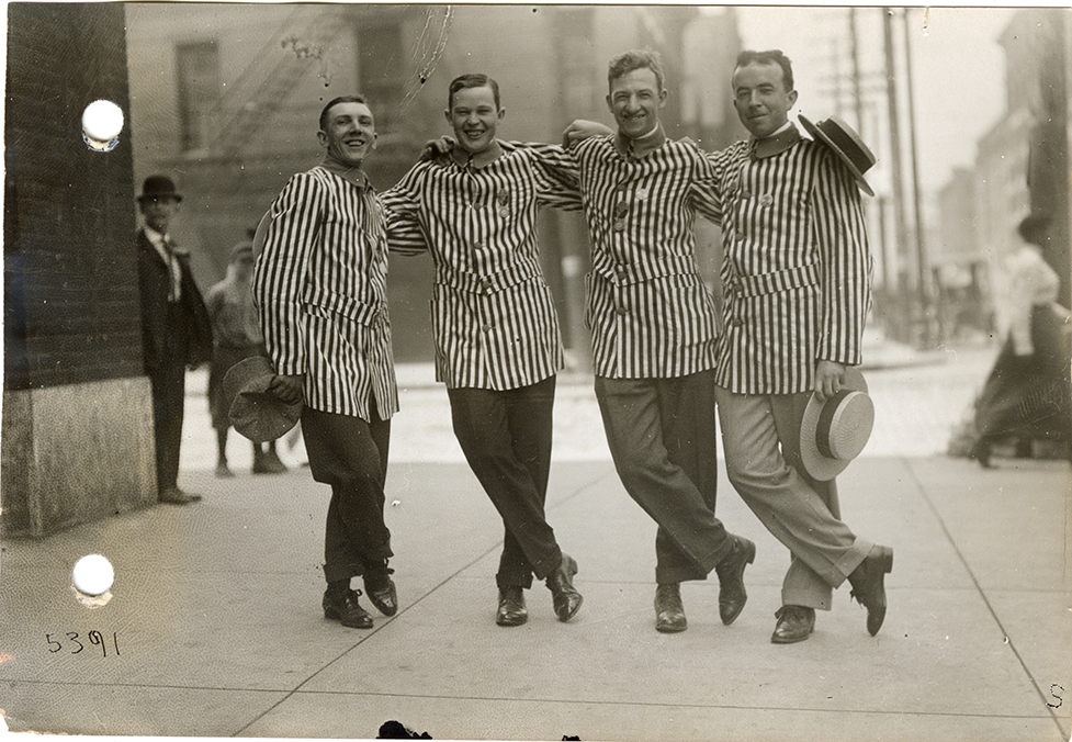View of four men wearing identical striped shirts, possibly a barbershop quartet, posing in street during the 1912 Federation of American Motorcyclists meet in Columbus, Ohio. Handwritten on back: "Federation American Motorcyclists, Columbus, Ohio, 1912."