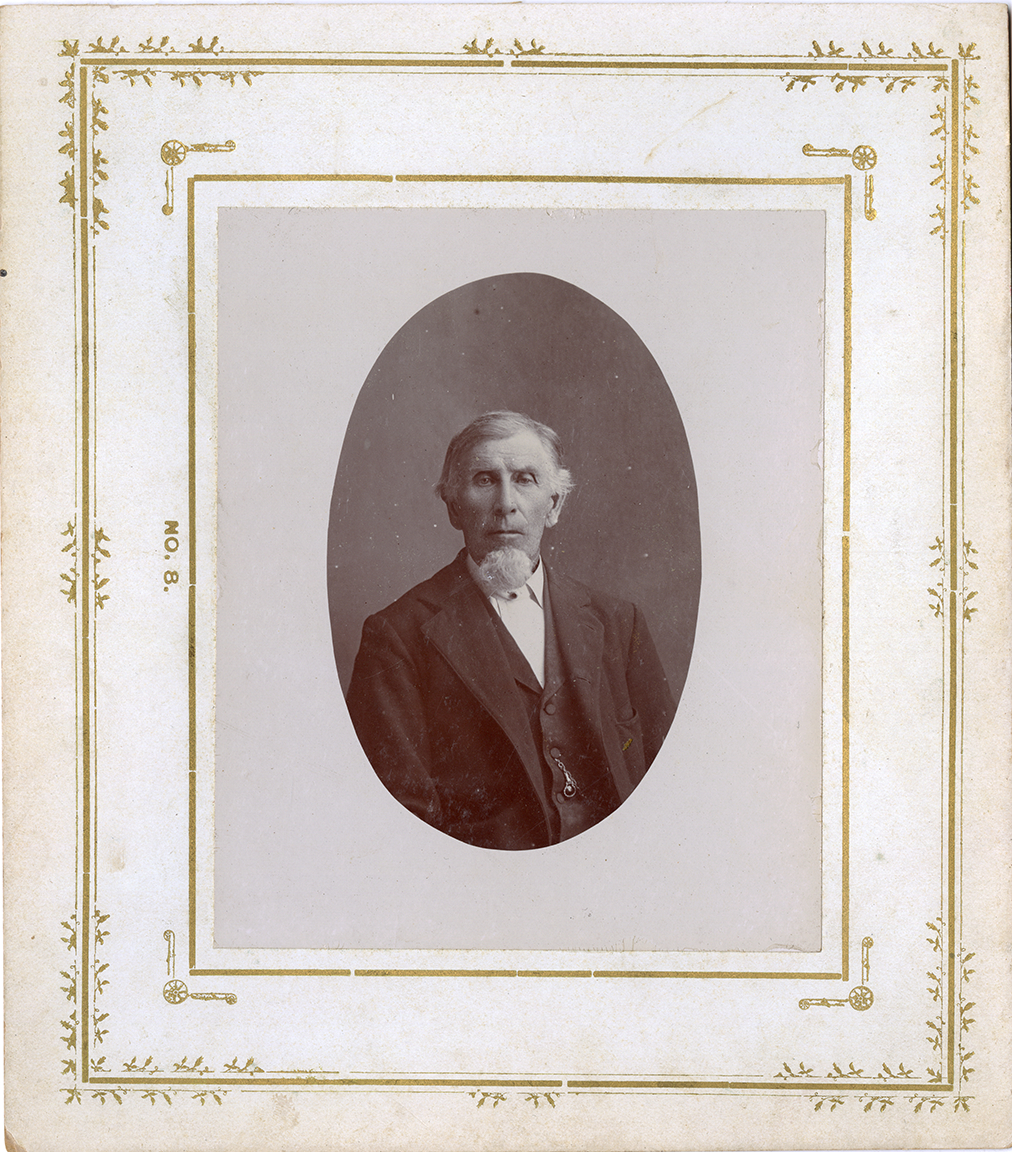 View of Seymour W. Ensign, Jr. of Montrose, Michigan. Printed on front: "No. 8." Label on back: "S.W. Ensign. The subject of this sketch is the oldest resident of the township, having come here with his parents, Mr. and Mrs. Seymour w. Ensign, Sr. in the summer of 1842."