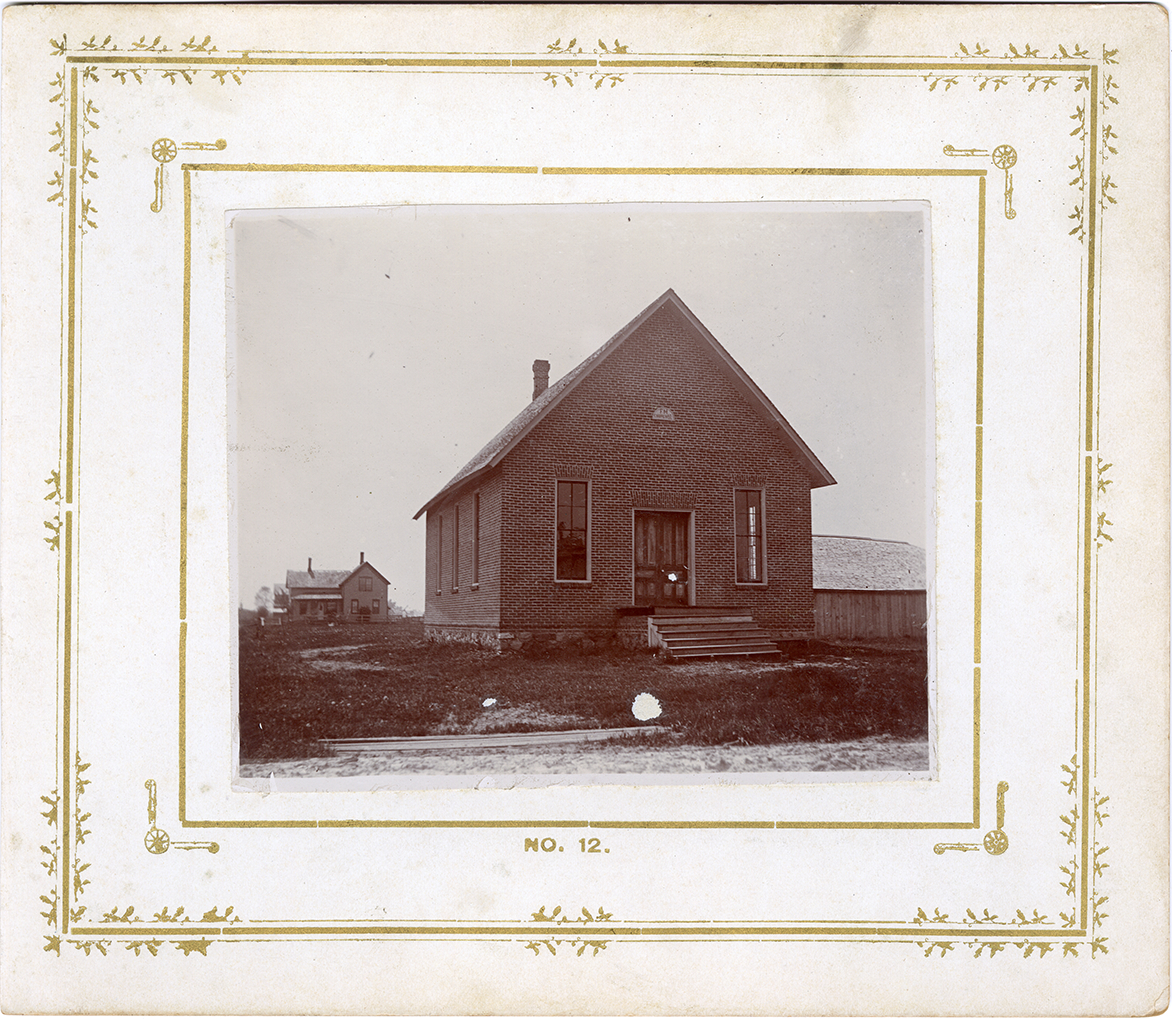 View of the Free Methodist church in Montrose, Michigan. Printed on front: "No. 12." Label on back: "F.M. church at Elk. This is a photograph of the Free Methodist church at Elk. It is built of brick and is nicely arranged in the interior. The building was erected in 1896, the committee having the work in charge being Fred Calkins, Rev. F.J. Calkins, Homer Wright, Charles Barret, Samuel Nelson and Rev. Roe. The dwelling shown in the rear is the Free Methodist parsonage. The Montrose Free Methodist church society was organized at the Slade school house, in 1896, by Rev. John Elison with eight charter members."