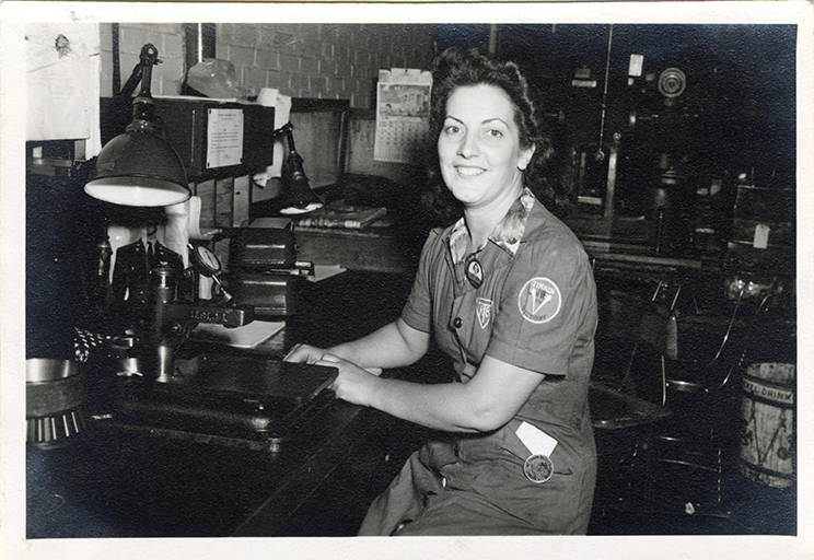 Portrait of Rose Ferrucci, cone checker at the Timken Roller Bearing Company in Canton, Ohio. Ferrucci poses at workbench. Timken was a major producer of bearings for the war effort. Handwritten on back: "Rose Ferrucci, O.P. cone checker, 1944."