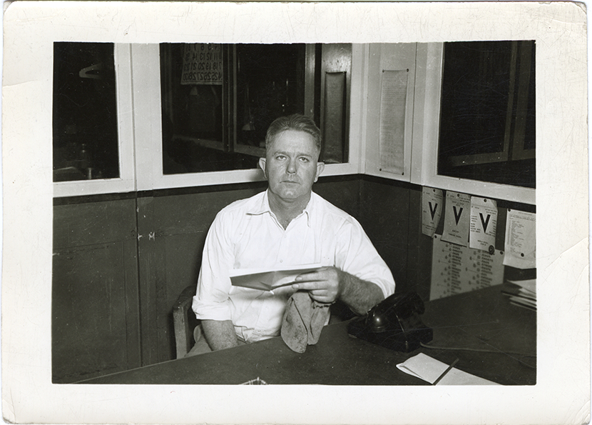 Portrait of Joseph C. Hufstetler at the Timken Roller Bearing Company in Canton, Ohio. Hufstetler poses at desk. Timken was a major producer of bearings for the war effort. Handwritten on back: "Joseph C. Hufstetler, 4052 Shepler Rd., S.W., Canton, O."