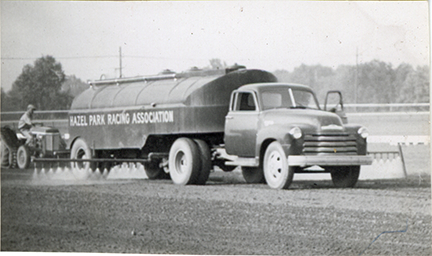 Sprinkler truck on racetrack, Hazel Park Raceway
