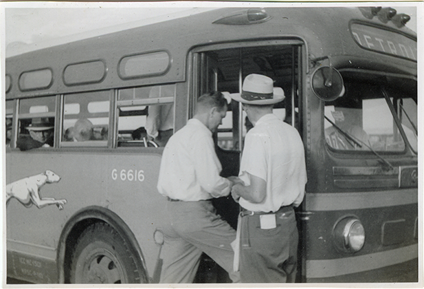 Jeff Robbins watching passenger boarding Greyhound bus, Hazel Park Raceway