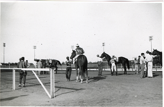 Part of an album of photographs taken by Cathie Monticelli. Inscribed inside front cover: "My book, at the race track, 1952 by Cathie Monticelli, 1426 Pearson Ave., Ferndale 20, Michigan."