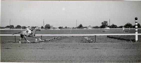 View of jockey riding first place horse at the Hazel Park Raceway. Handwritten on page: "All at Hazel Park track, August, 1952. Coming in first."
