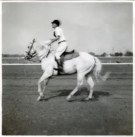 View of a steward riding a horse at the Hazel Park Raceway. Handwritten on page: "All at Hazel Park, August, 1952. A Hazel Park steward, Aug. '52."