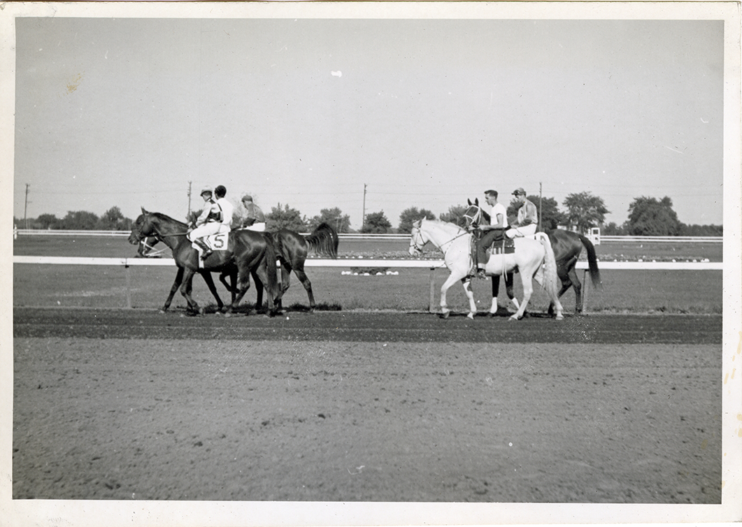 Jockeys and groom walking horses on track, Hazel Park Raceway