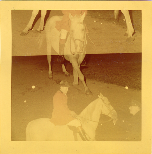 Double exposure of steward James E. Stolte posing on horse "Nar" at the Michigan Racing Association racetrack in Livonia, Michigan. Handwritten on page: "Monday nite, October 6th, '52 at Detroit race track, harness races. Jim and Nar. (Double exposures when camera jammed)."
