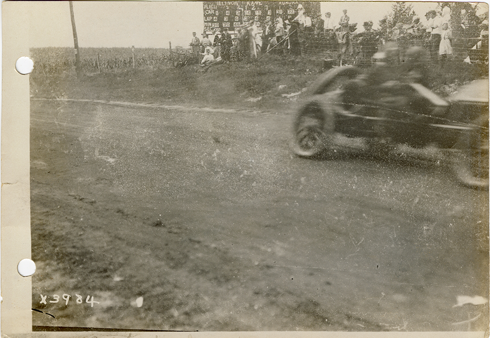 View of Hughie Hughes driving Mercer car no. 15 during the 1911 Elgin National Stock Chassis races in Illinois. Spectators on roadside. Stamped on back: "Spooner & Wells, Inc., photographers, telephones 3472-3473 Columbus, 1931 Broadway, New York." Handwritten on back: "Hughes, Mercer #15. Winner Kane Co. trophy race."