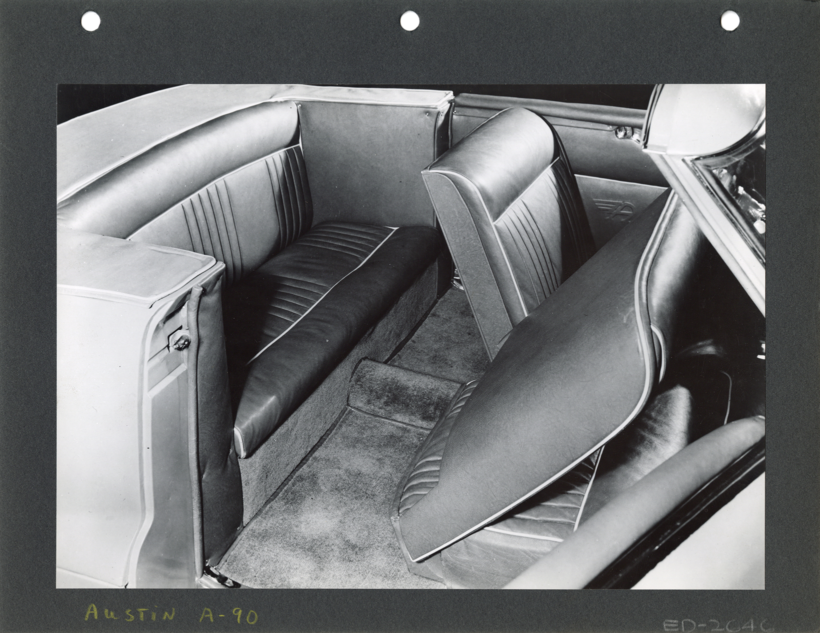 View of the interior of an Austin A90 car, showing front and rear seats. Handwritten on front: "Austin A-90."