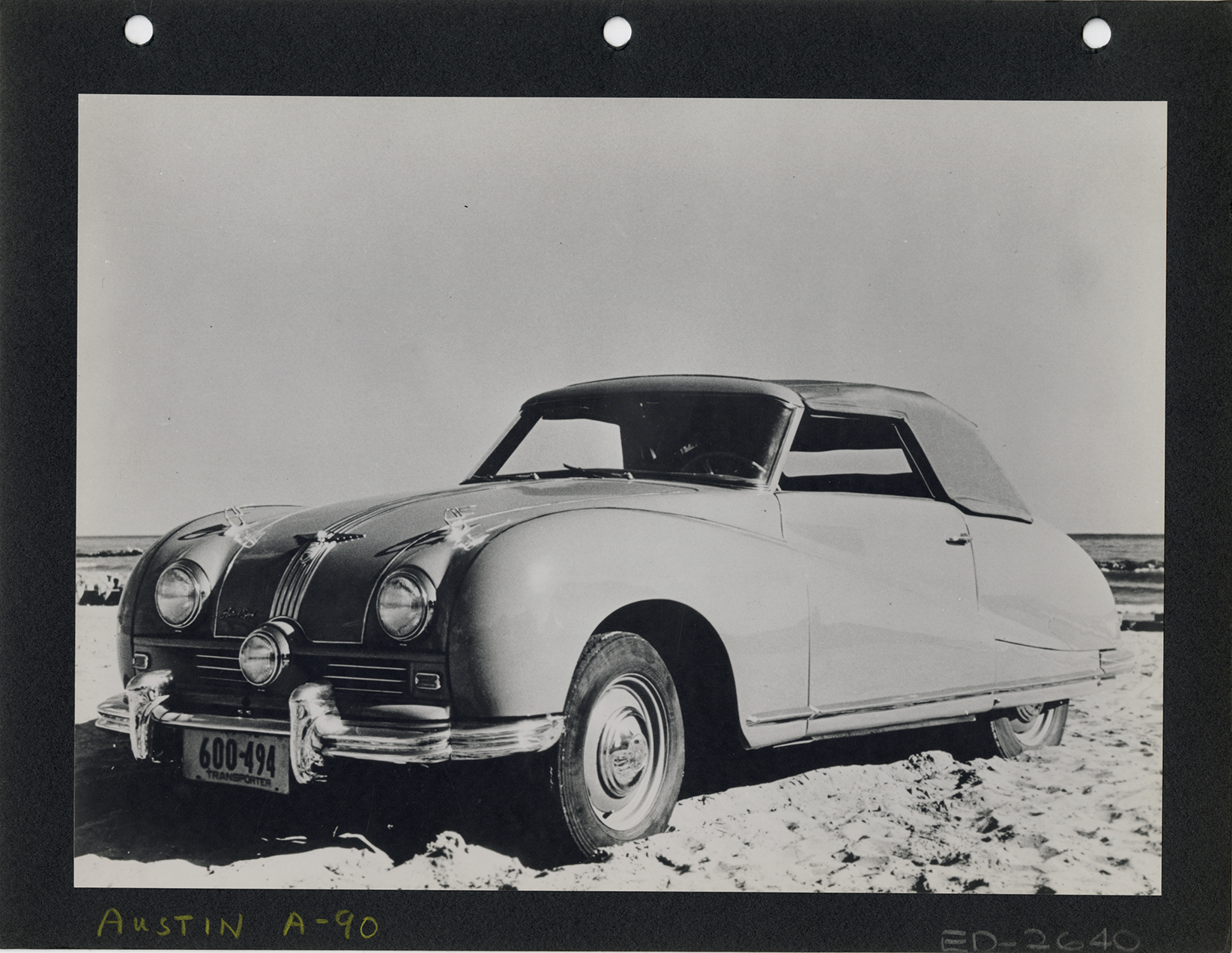 View of an Austin A90 convertible, with top up. Handwritten on front: "Austin A-90."