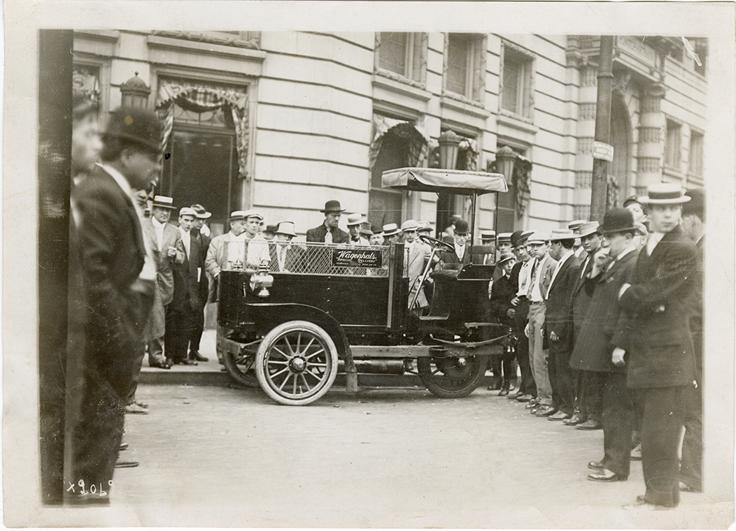 View of spectators surrounding a Wagenhals vehicle. "Wagenhals special delivery" plate is affixed to vehicle. Pontchartrain Hotel in background. Stamped on back: "Spooner & Wells, Inc., photographers, telephone North 1745. 1231 Woodward Ave., Detroit, Mich. Detroit, 1231 Woodward, New York, 1931 Broadway." Handwritten on back: "Wagenhals, 1911."