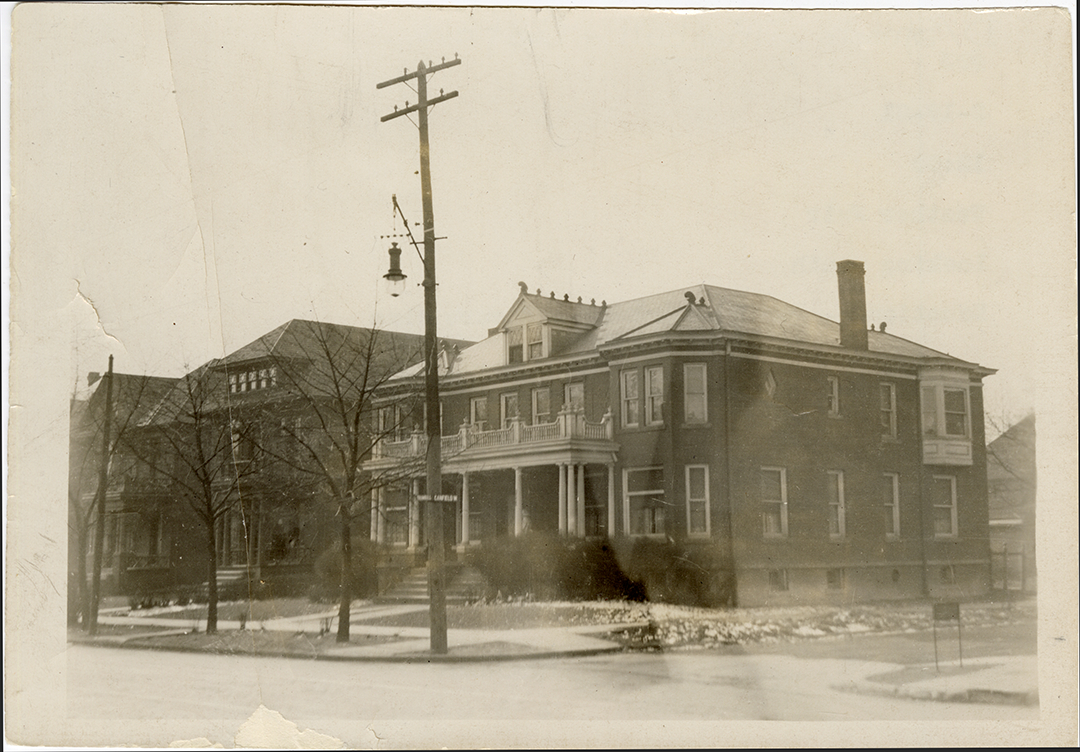 View of houses on Trumbull near the corner of Canfield. Two-story house on corner has covered entry porch, roof dormer and hipped roof. Typed on back: "#93. 2-19-21. 12:00. Weather fair. Looking south. Location: 40' N of N Canfield curb line, 10' E of E Trumbull curb line. Subject: Showing south corner of Canfield & Trumbull. Detail of streets, obstructions, overhead, etc."