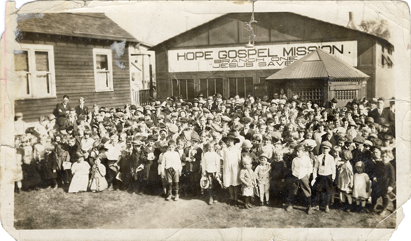 View of a crowd of men, women and children posing in front of the Hope Gospel Mission church. Sign on building reads: "Hope Gospel Mission. Branch One. Jesus saves." Handwritten on back: "Cardoni & Nevada Sts., Det., Mich. May, 1923."