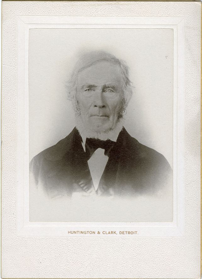 Portrait of James Finn. Printed on front: "Huntington & Clark, Detroit." Handwritten on back: "James Finn. Born Feb. 4, 1783. Died Apr. 17, 1864. Buried at Clarks Green, Pa. Married 1804 to Polly Wells. Father of Rev. Silas Finn. Grandfather of Albert Henry Finn. Great grandfather of James Crampton Finn, Juliette Irene Finn, Silas Munger Finn. Great great grandfather of James Crampton Finn, Jr., Cynthia Finn Galbraith, Dorcas Finn Brolin."
