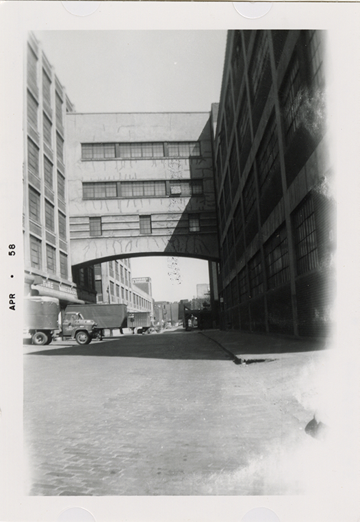 View of an elevated walkway for the J.L. Hudson Company warehouse over Beacon St. Truck partially visible on left. Printed on front: "Apr 58." Handwritten on back: "J.L. Hudson Company warehouse over Beacon Street."