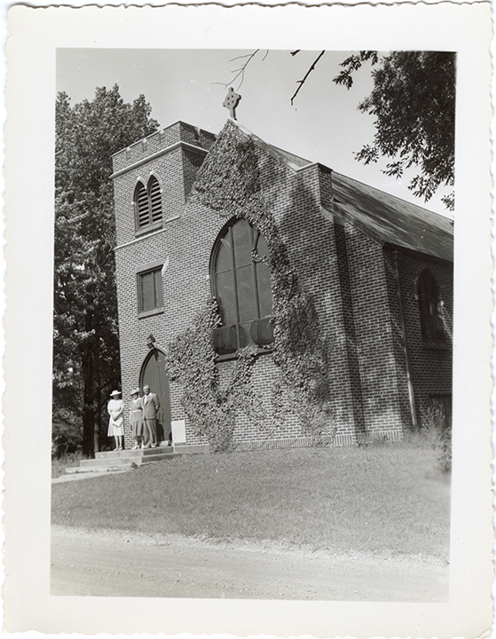 View of a man and two women posing in front of St. Paul's Episcopal Church on Harsens Island. Handwritten on back: "St. Paul's Episcopal Church."