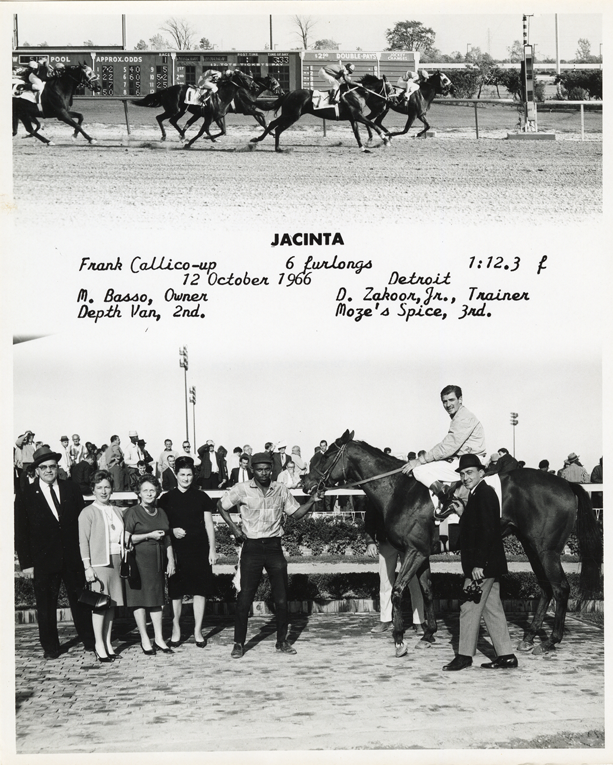 View of jockey and several men and women posing with racehorse Jacinta at the Detroit Race Course. Includes view of photo finish. Printed on front: "Jacinta. Frank Callico-up. 6 furlongs, 1:12.3 f. 12 October 1966, Detroit. M. Basso, owner. D. Zakoor, Jr., trainer. Depth Van, 2nd. Moze's Spice, 3rd."