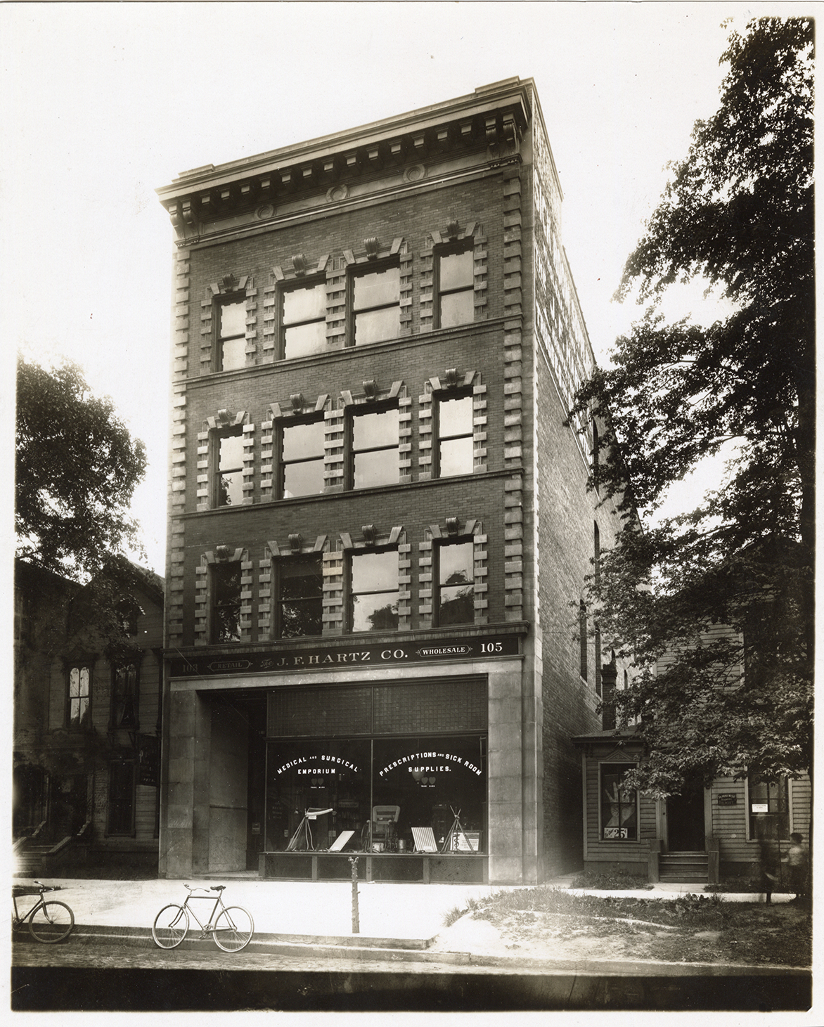 View of the J.F. Hartz Co. building, located at 103-105 Broadway. "Medical and surgical emporium, prescriptions and sick room supplies" is painted on windows. Bicycles on curb.