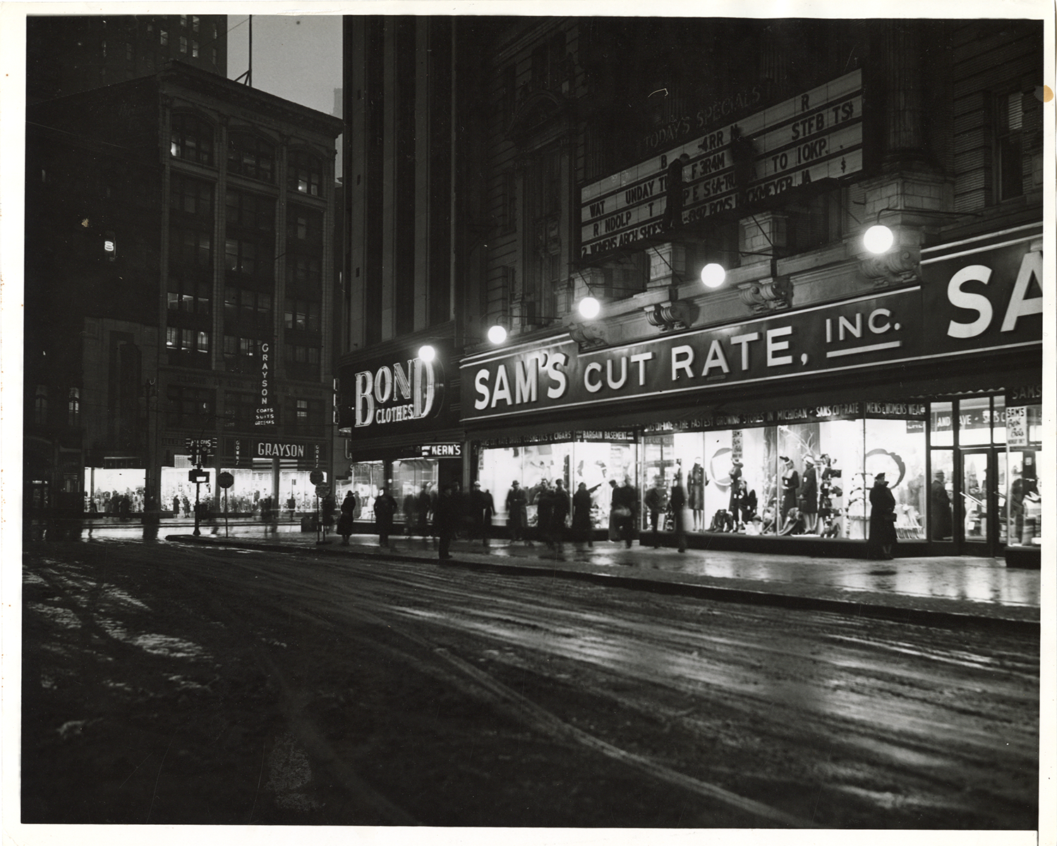 Nighttime view of Sam's Cut Rate Inc. store. Bond Clothes on corner. Stamped on back: "Feb (5) 6, 1940."