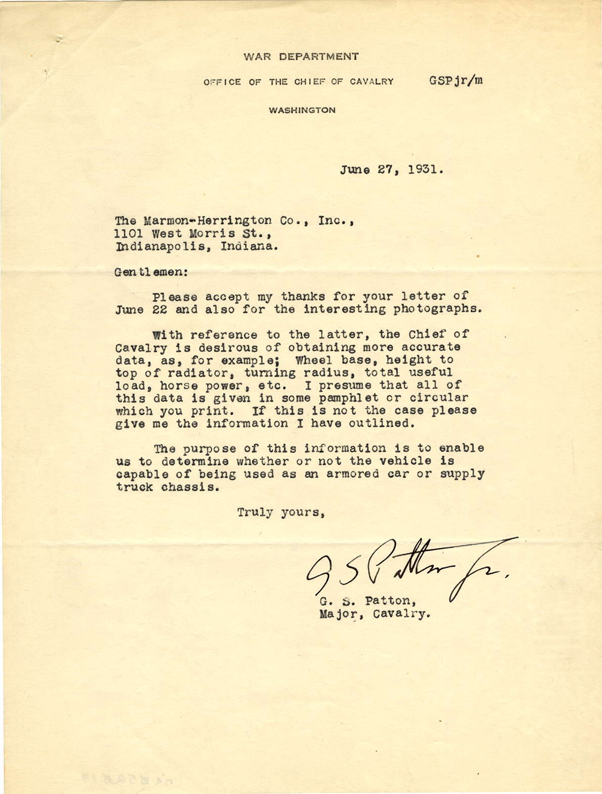 Letter from Major George S. Patton requesting further information on a military vehicle manufactured by the Marmon-Herrington Company. Letter reads: "June 27, 1931. Gentlemen: Please accept my thanks for your letter of June 22 and also for the interesting photographs. With reference to the latter, the Chief of Cavalry is desirous of obtaining more accurate data, as for example; wheel base, height to top of radiator, turning radius, total useful load, horse power, etc. I presume that all of this data is given in some pamphlet or circular which you print. If this is not the case please give me the information you have outlined. The purpose of this information is to enable us to determine whether or not the vehicle is capable of being used as an armored car or supply truck chassis. Truly yours, [signed] G S Patton, Jr. G.S. Patton, Major, Cavalry." Printed on front: "War Department, Office of the Chief of Cavalry, Washington."