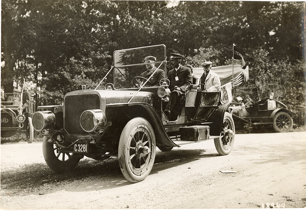 View of motorists in 1906 Stevens-Duryea car during the Around Long Island Tour. "Around Long Island, 2" sign on car. Handwritten on back: "Stevens-Duryea, 1906."