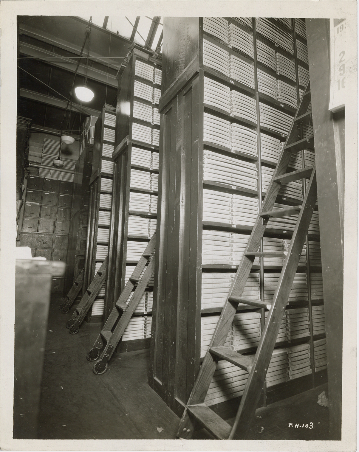 View of the stacks at Evans-Winter-Hebb. Boxes are stacked on shelves; rolling ladders in aisles.