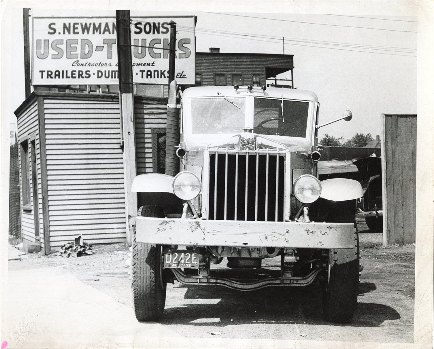 Front view of a Sterling truck. Sign on building in background reads: "S. Newman & Sons used trucks, contractors [undecipherable], trailers, dumps, tanks, etc."