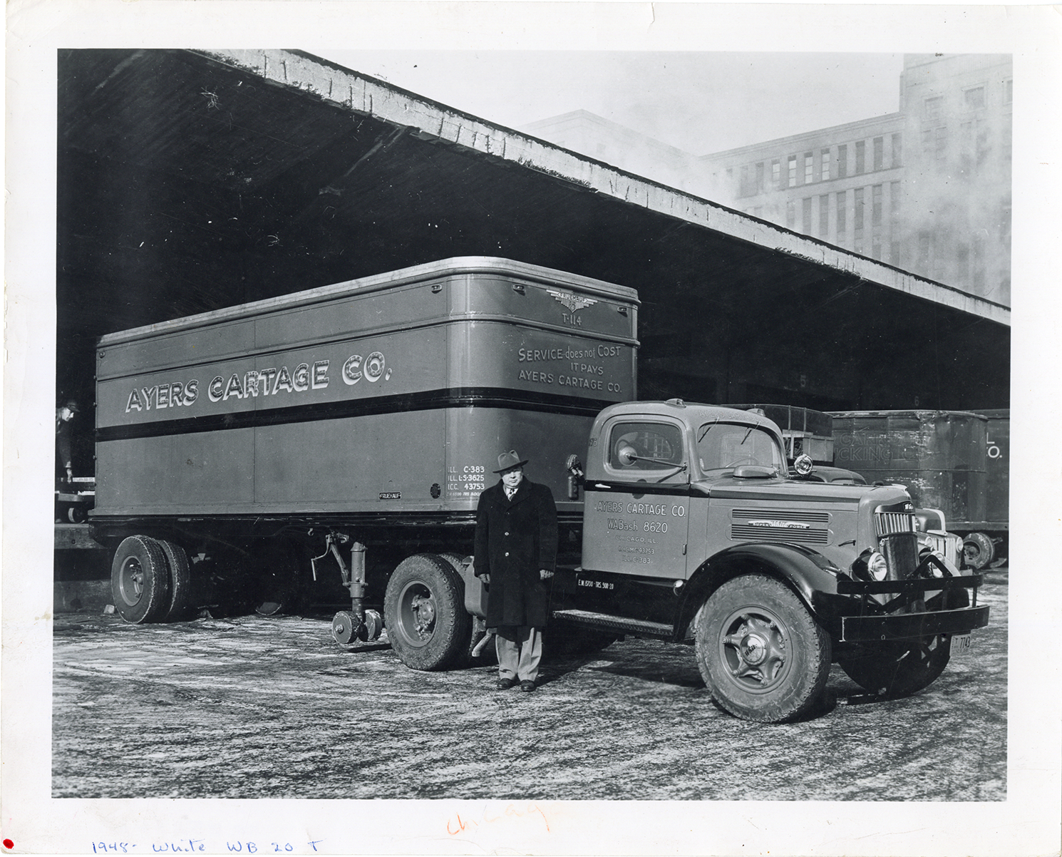 View of a man posing with a 1948 White truck, owned by the Ayers Cartage Co. Lettered on trailer: "Ayers Cartage Co. Service does not cost, it pays." Lettered on cab: "Ayers Cartage Co., Wabash 8620, Chicago, Ill." Stamped on back: "The White Motor Company, Cleveland. 382202. Advertising Dept." Handwritten on front: "1948 White, WB 20 T."