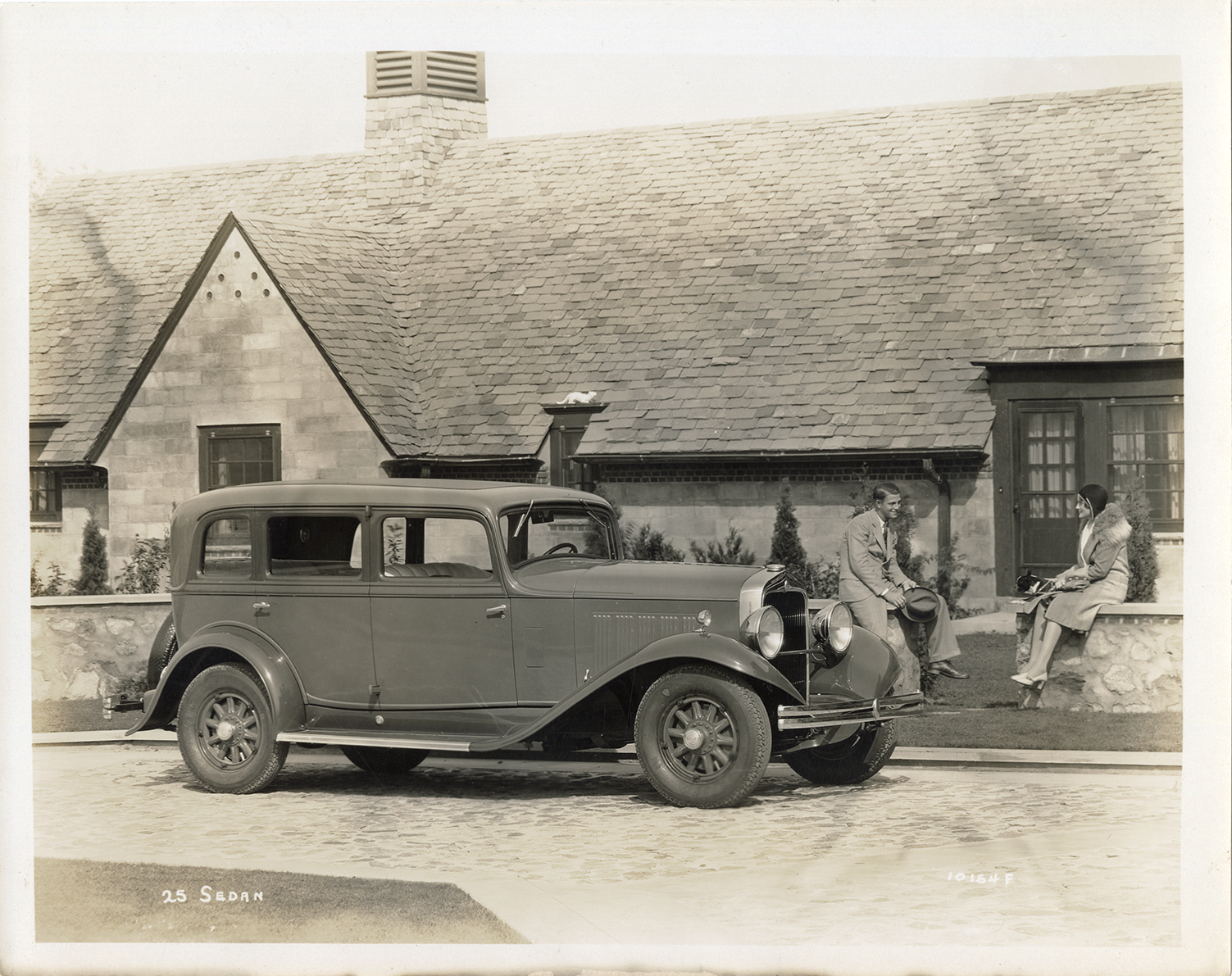View of a man and woman posing with a 1932 Reo sedan. Stone house with slate roof in background. Printed on front: "25 sedan." Handwritten on back: "1932 Reo sedan."