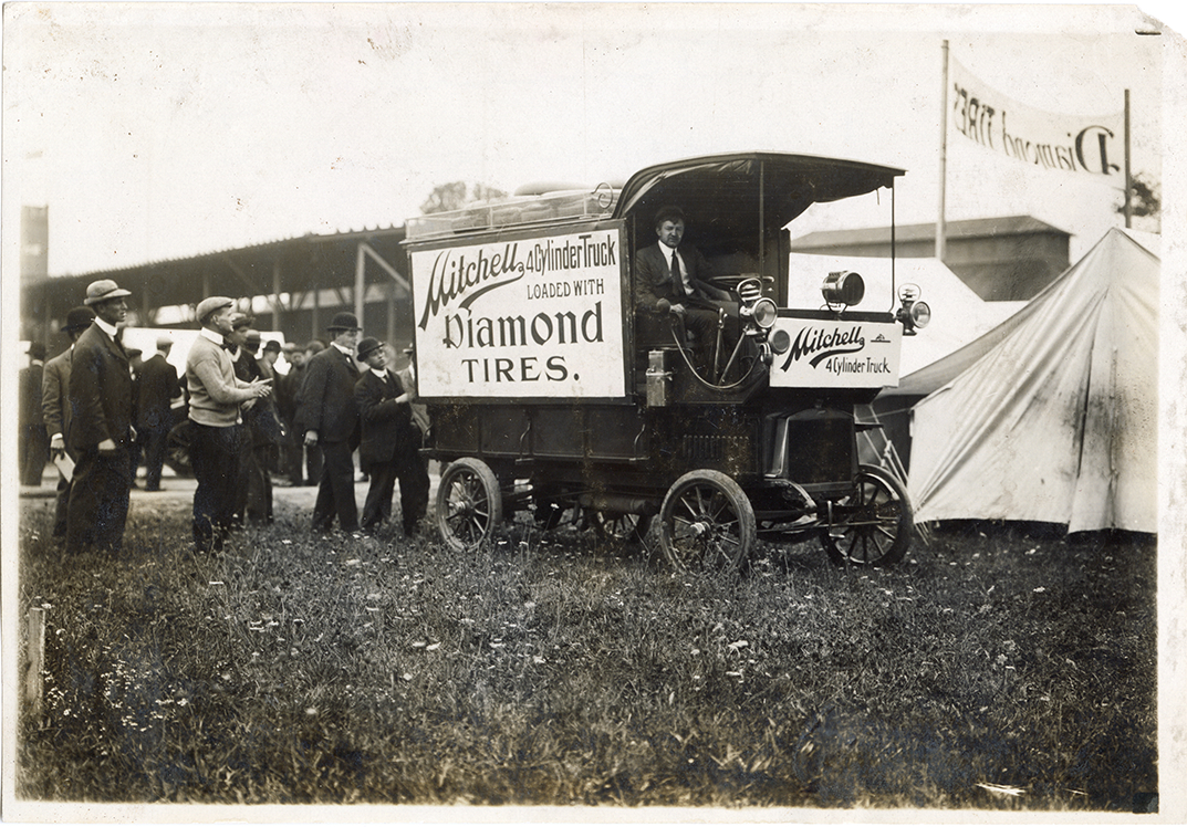 View of a motorist posing in a Mitchell truck, loaded with Diamond tires. Sign on truck reads: "Mitchell, 4 cylinder truck loaded with Diamond tires." Tent on right; men stand behind truck. Handwritten on back: "Mitchell truck, Diamond tires."
