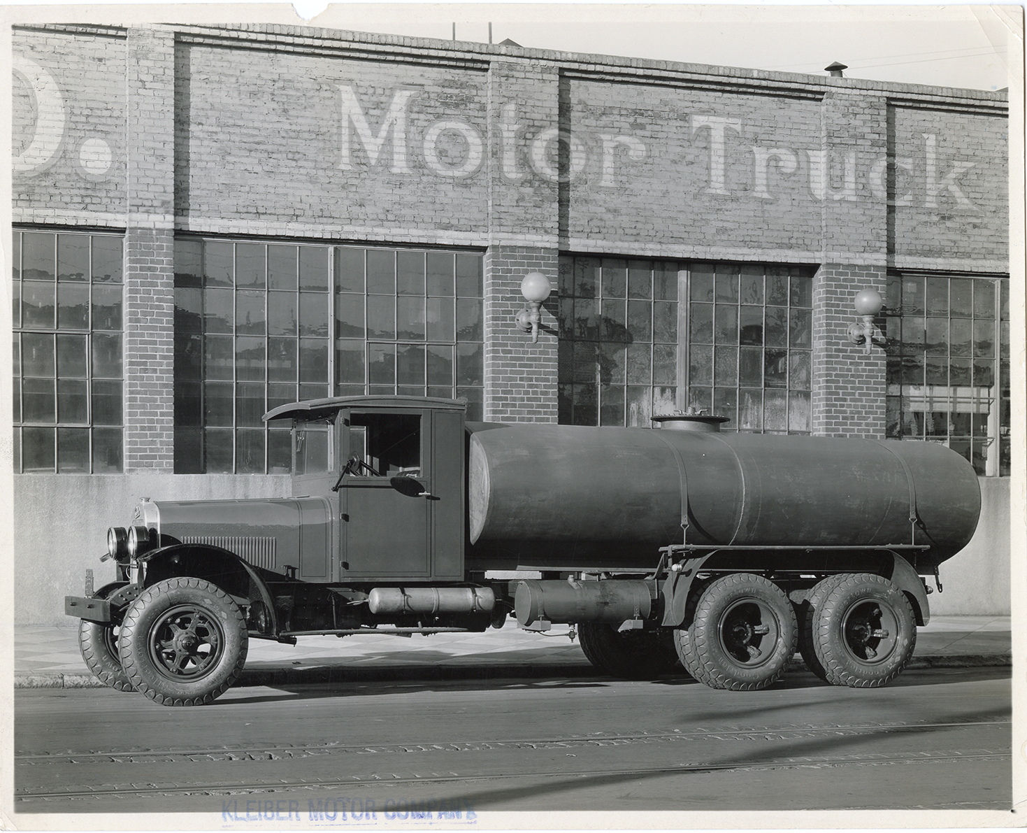 View of a Kleiber tanker truck. Factory building in background. Stamped on front: "Kleiber Motor Company." Stamped on back: "Kleiber Motor Company, 1480 Folsom St., San Francisco, Cal." and "Morton photographs. Morton & Co., commercial photography. 515 Market St., San Francisco, Calif. Telephone Douglas 0154." Handwritten on back: "Kleiber, ca. 1928."