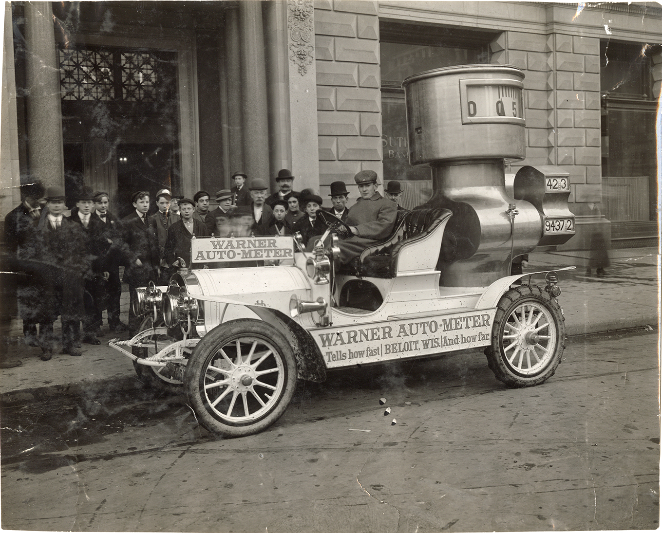 View of driver posing in the Warner Auto-Meter car. Car body is shaped like an Auto-Meter; sign on side of car reads: "Warner Auto-Meter, tells how fast and how far, Beloit, Wis." Onlookers in background. Stamped on back: "Spooner & Wells, Inc., photographers, telephones 3472-3473 Columbus, 1931 Broadway, New York." Handwritten on back: "Accessories."