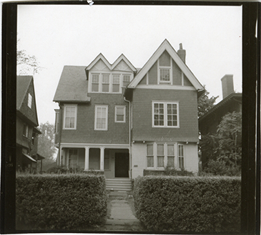View of a three-story wooden-frame house with covered entry porch at 971 Burns, formerly 195, in the Indian Village neighborhood of Detroit, Michigan. The house was built in 1900 and formerly owned by William Kales. Handwritten on back: "971 (195) Burns." Original photograph is reversed.