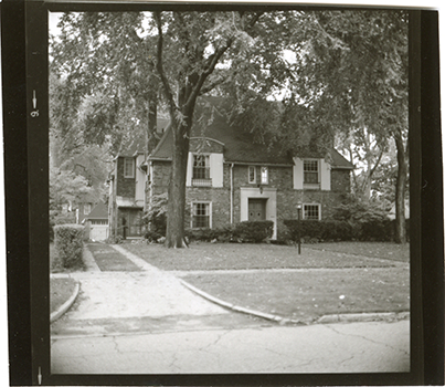 View of a two-story French Eclectic style brick house at 2210 Burns, formerly 500, in the Indian Village neighborhood of Detroit, Michigan. Handwritten on back: "2210 (500) Burns." Original photograph is reversed.