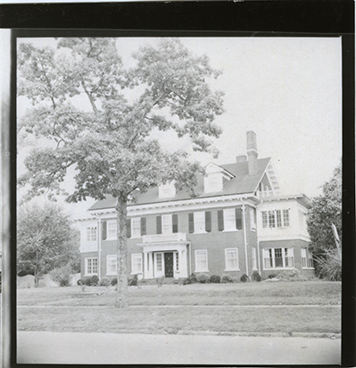 View of a two-story Colonial revival style brick house at 2410 Burns, formerly 500, in the Indian Village neighborhood of Detroit, Michigan. Handwritten on back: "2410 (500) Burns." Original photograph is reversed.