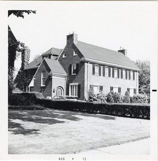 View of a two-story Colonial revival style brick house at 2430 Burns in the Indian Village neighborhood of Detroit, Michigan. Printed on front: "Aug 73." Handwritten on back: "2430 Burns. Built by John Owen, 1925."