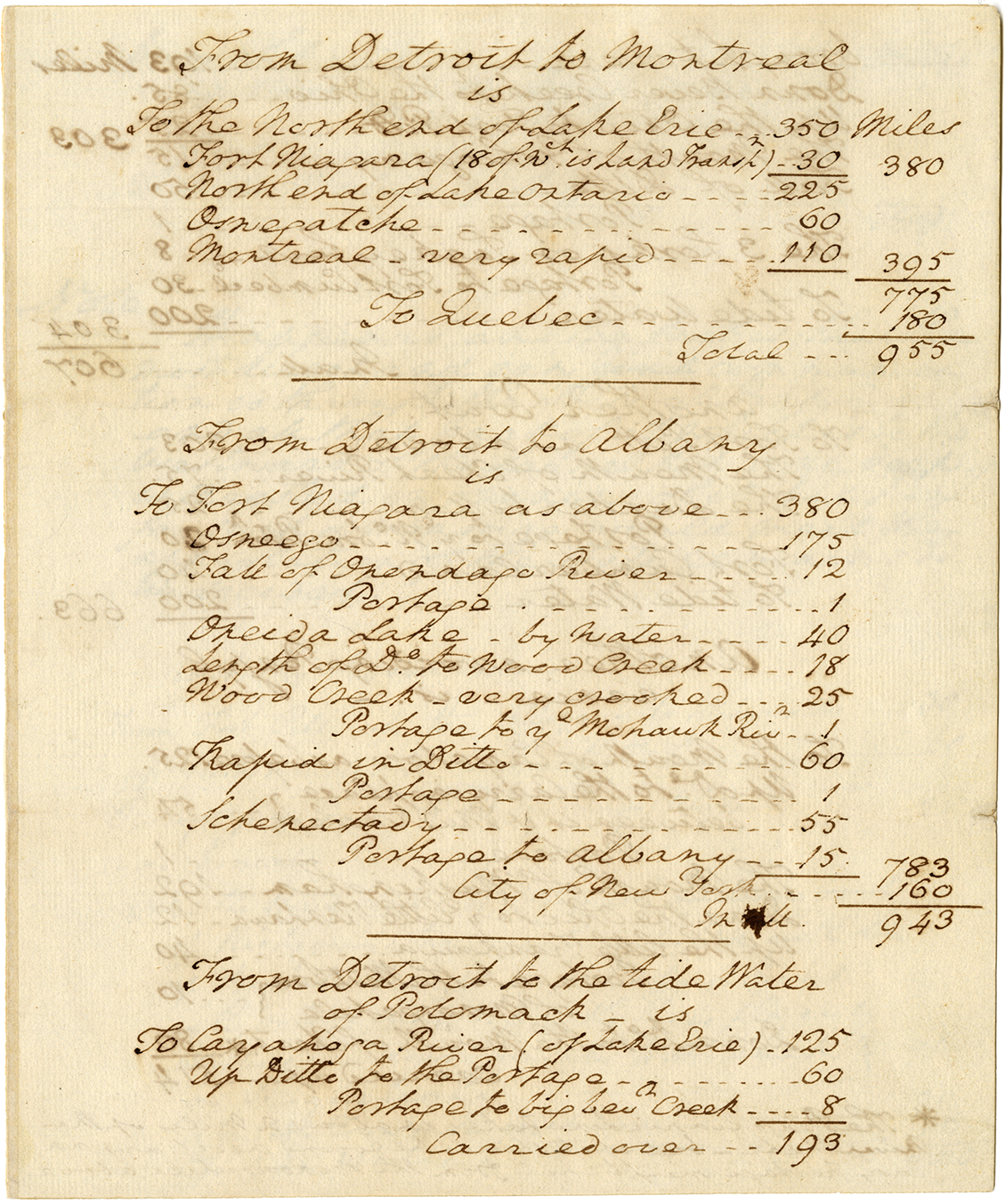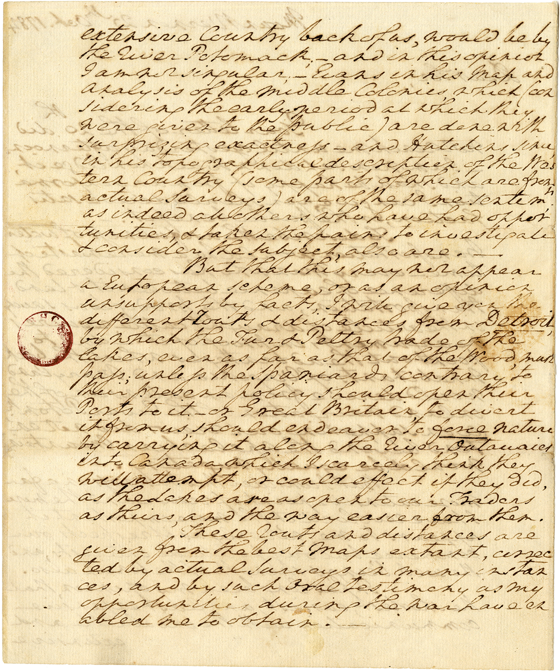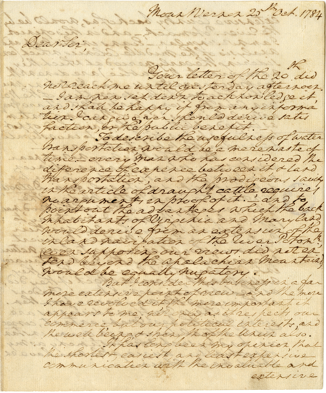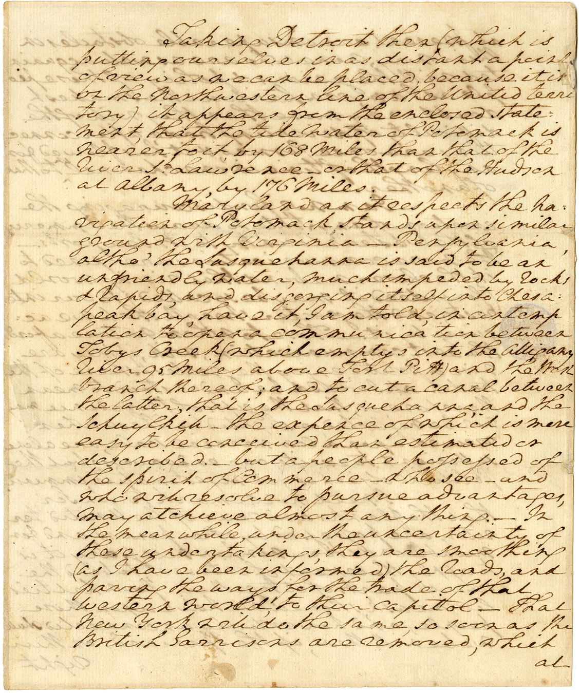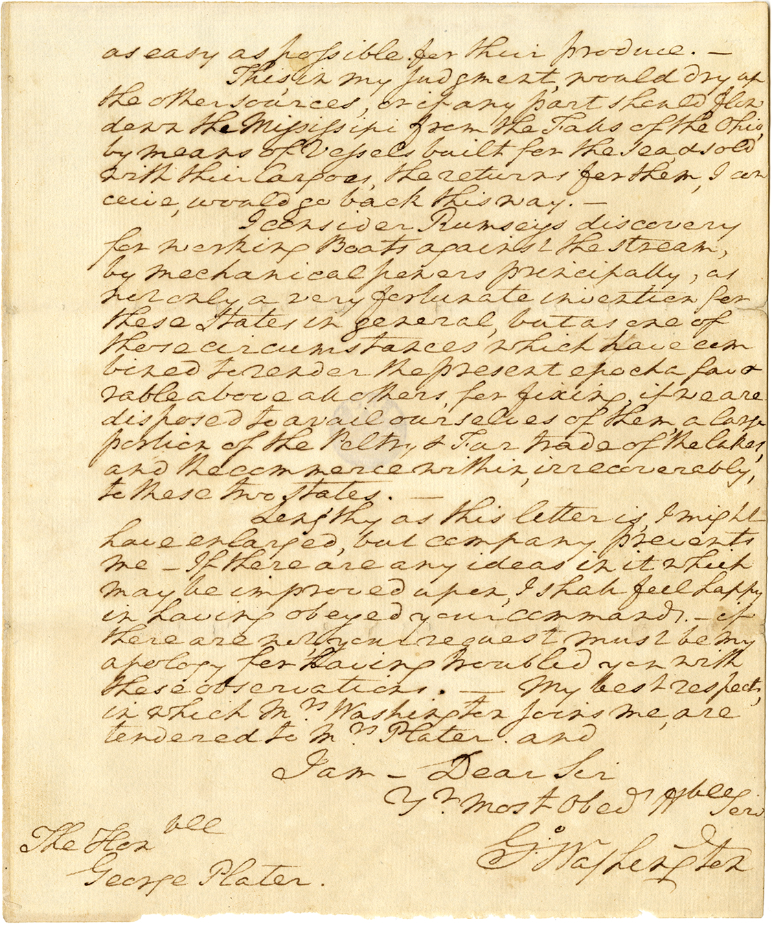 Letter from George Washington to George Plater, dated October 25, 1784, proposing six different water routes from Detroit to the East, as a means of diverting the commerce of the West from the British and Spanish. Written to a leading citizen of Maryland, this letter is almost identical with his letter of October 10, 1784 to Benjamin Harrison, governor of Virginia, and was part of the promotional campaign of the Potomac Navigation Company, of which Washington became the first president.