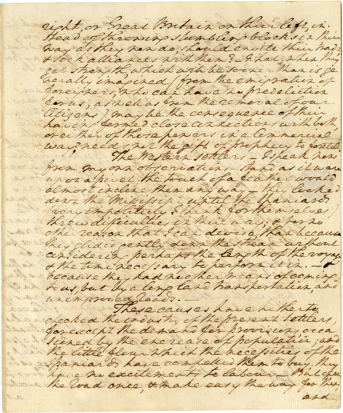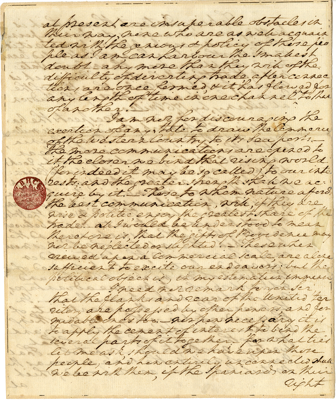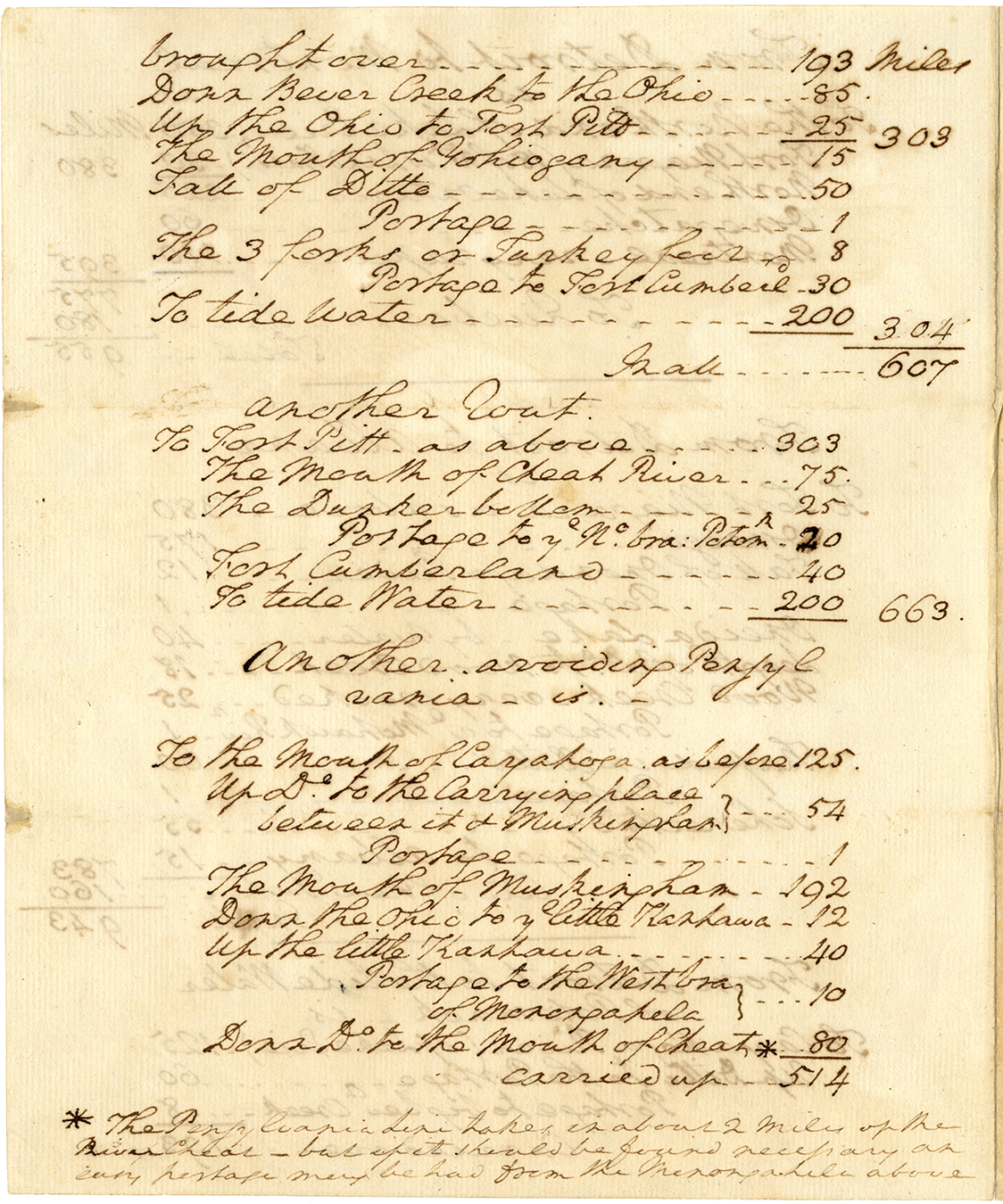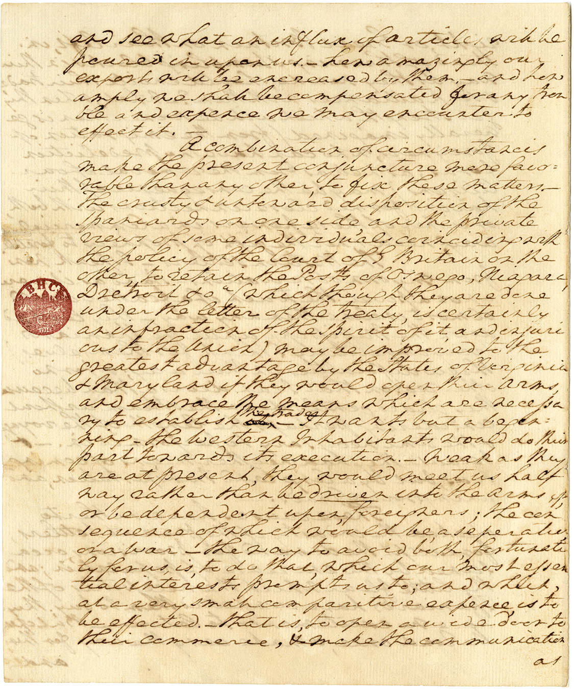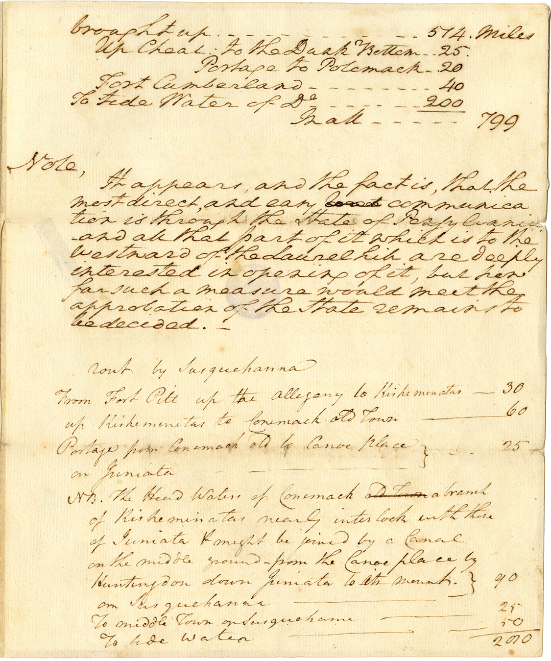 Letter from George Washington to George Plater, dated October 25, 1784, proposing six different water routes from Detroit to the East, as a means of diverting the commerce of the West from the British and Spanish. Written to a leading citizen of Maryland, this letter is almost identical with his letter of October 10, 1784 to Benjamin Harrison, governor of Virginia, and was part of the promotional campaign of the Potomac Navigation Company, of which Washington became the first president.