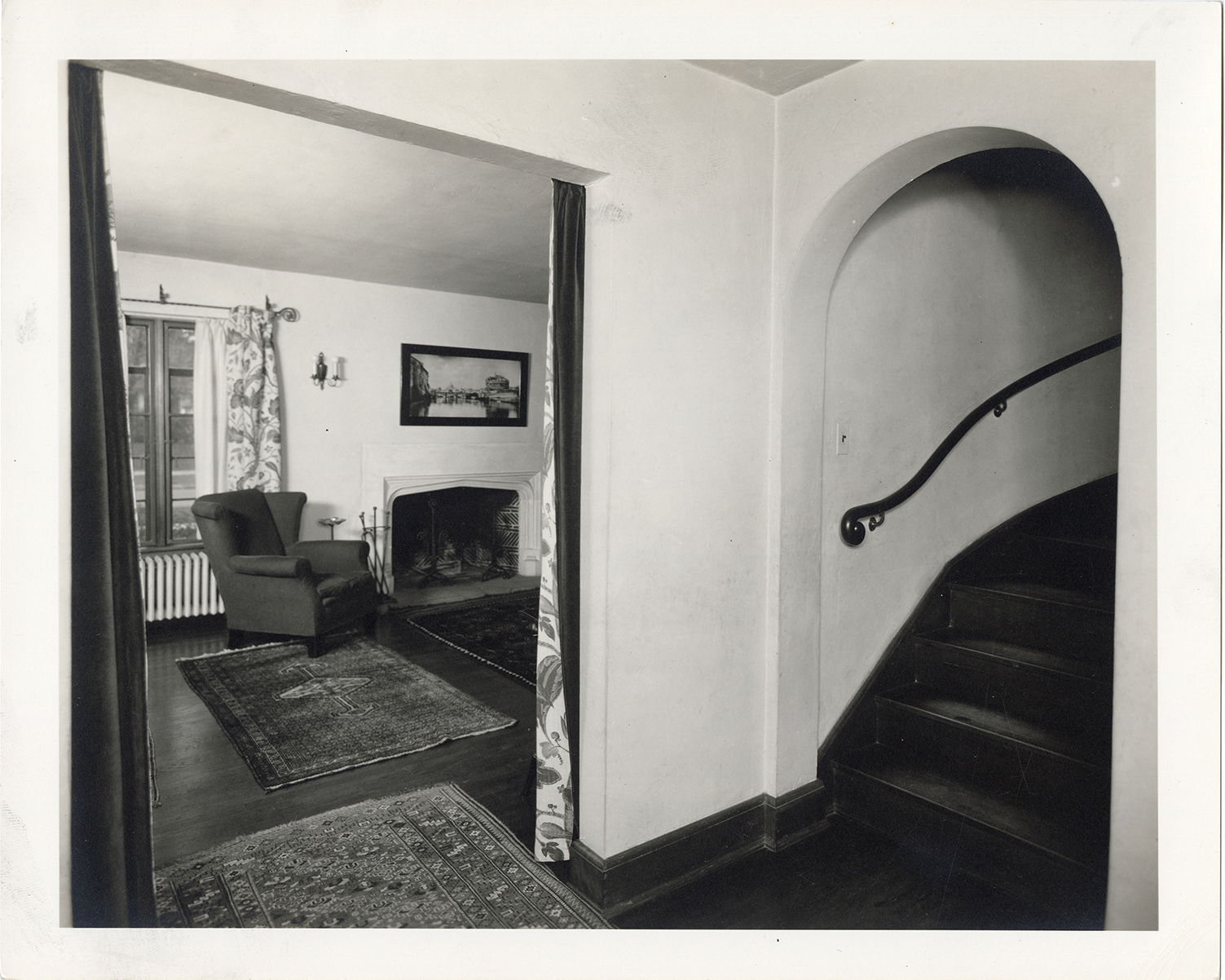View of the interior of the superintendent's cottage, Methodist Children's Home, showing stairwell. Living room with armchair and fireplace in background. Handwritten on back: "Superintendent's cottage."
