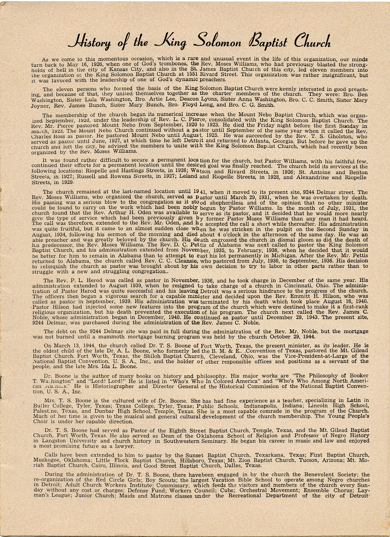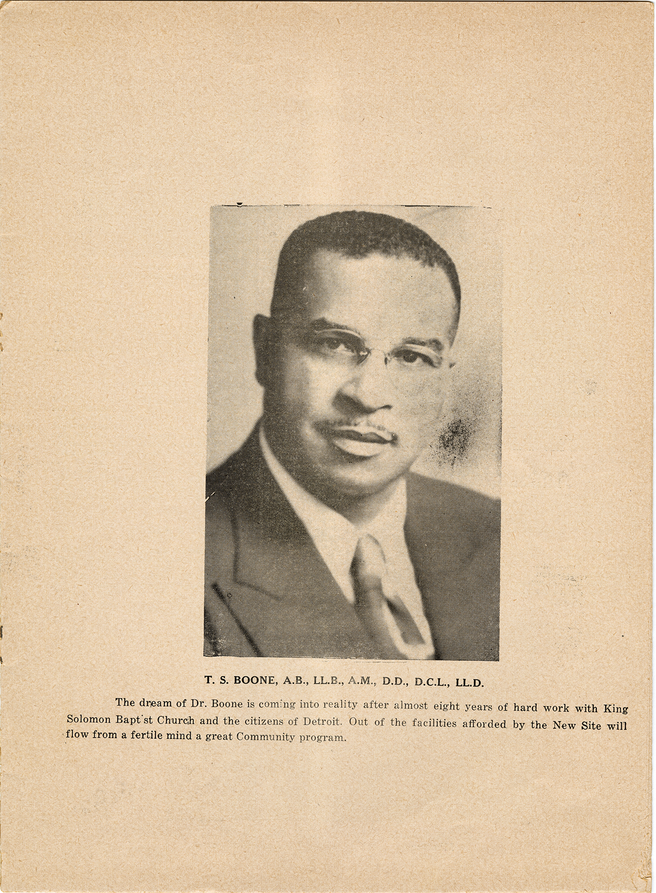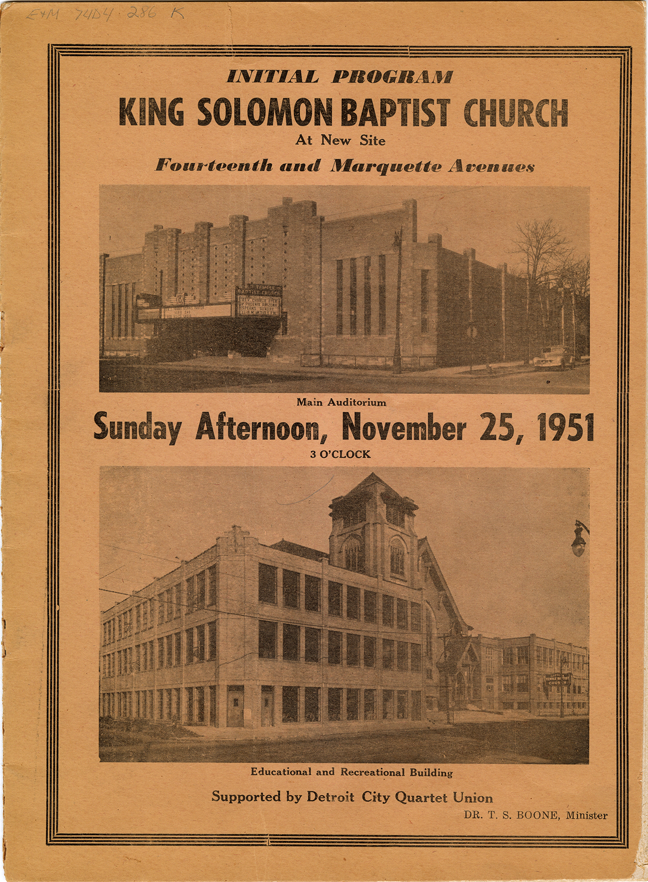Initial program, King Solomon Baptist Church at new site : Fourteenth and Marquette Avenues : Sunday afternoon, November 25, 1951, 3 o'clock : supported by Detroit City Quartet Union : Dr. T.S. Boone, minister / King Solomon Baptist Church.