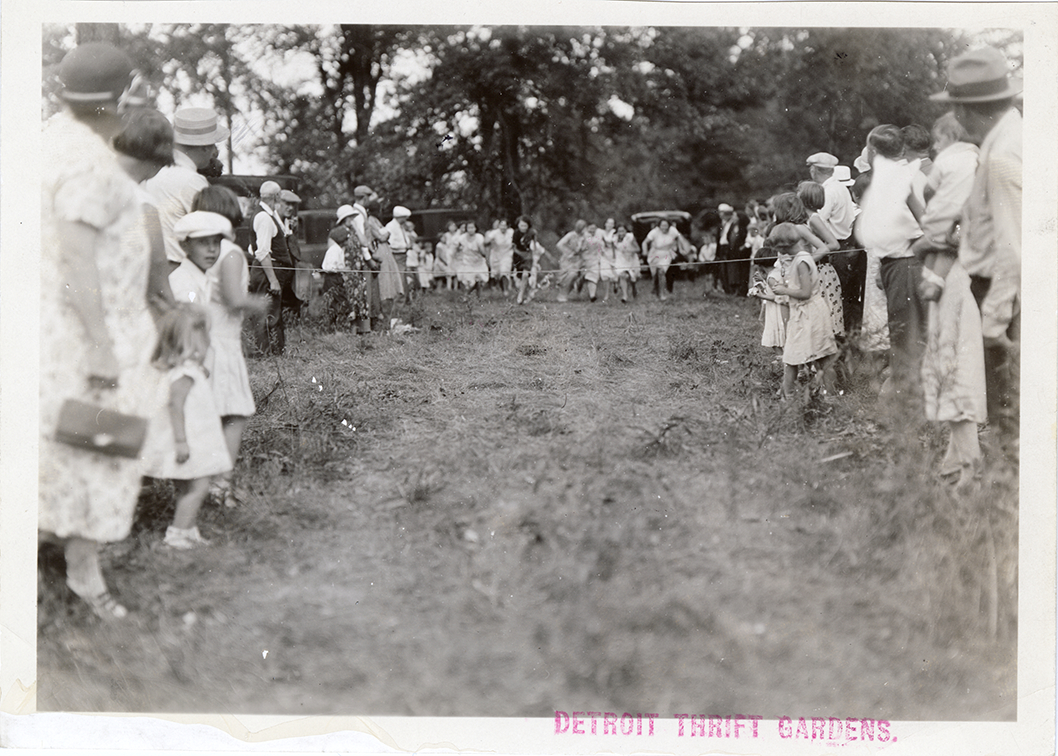 View of crowd watching a footrace at the Detroit Thrift Gardens. Stamped on front: "Detroit Thrift Gardens." Stamped on back: "Detroit Thrift Gardens."