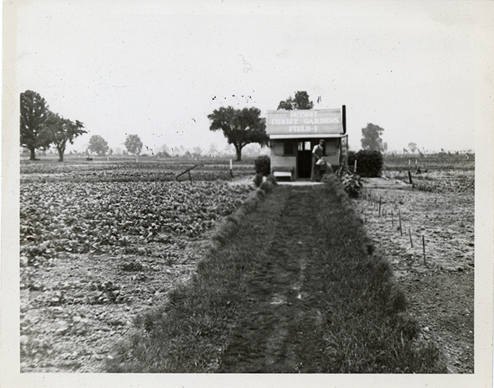 View of a shed in Field I, Detroit Thrift Gardens. "Detroit Thrift Gardens, Field I" is lettered on roof. Man with watering can stands in front of shed.
